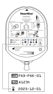 - Retournez le DAE afin de récupérer les information du PAD PAK pré-connecté dans le DAE. Les informations sont indiquées sur le PAD PAK au niveau du sablier.